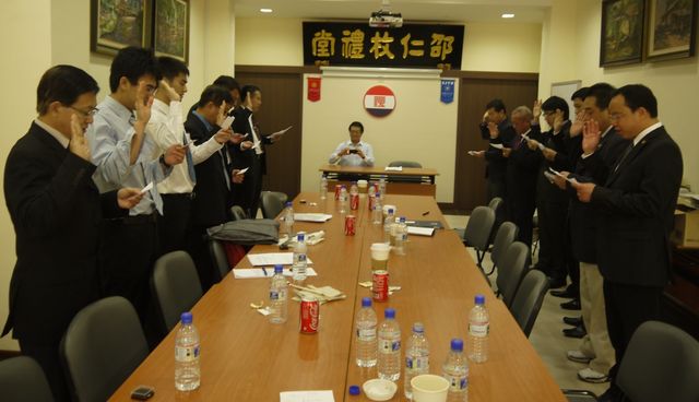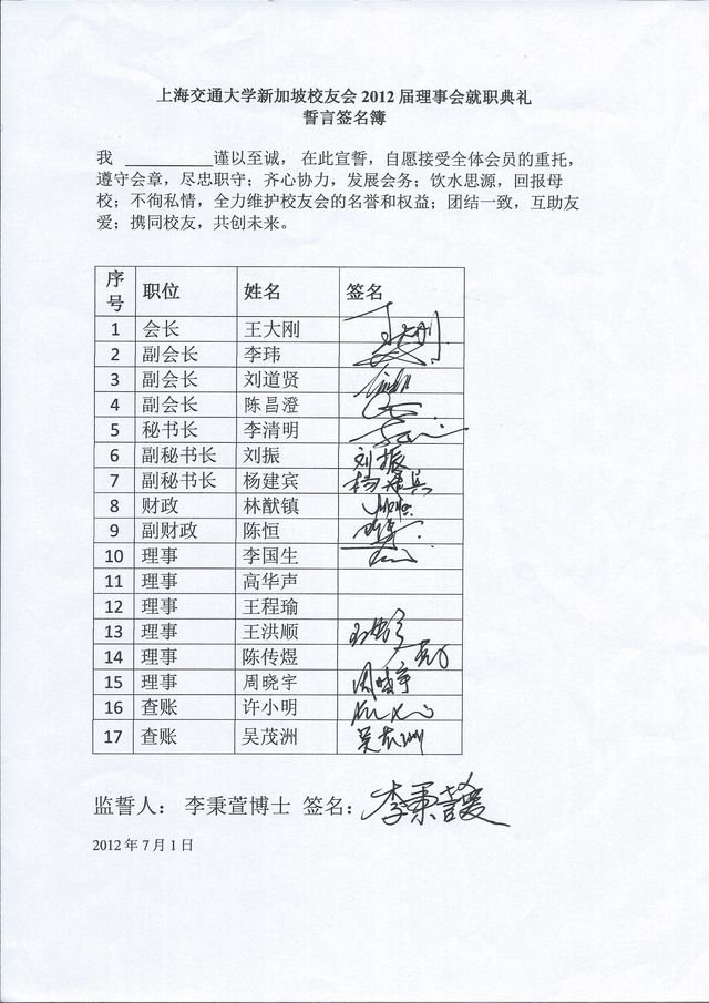 为了凝聚理事们为校友服务的精神,强化理事们为校友奉献的激情,经理事提议,第一次理事会表决通过,理事会决定按新加坡社团传统举办就职典礼。通过理事会全体理事共同努力,在第二次理事会结束后举办了简单而又隆重的宣誓就职典礼,并荣幸的请来了新加坡宗乡联合总会副秘书长,新加坡三江会馆馆长李秉萱博士见证宣誓,各位理事在会长王大刚的带领下一起宣读誓词。